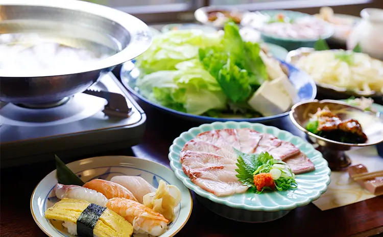 福を呼ぶ「ふぐ」と開運を呼ぶ「うなぎ」を一度に楽しめるコースや、ぶりしゃぶ会席など‥。2名様より承ります!